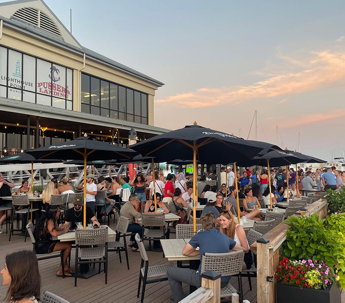 Open-air seating on Canton’s marina—harbor views, sun or shade, and plenty of space for friends & family.