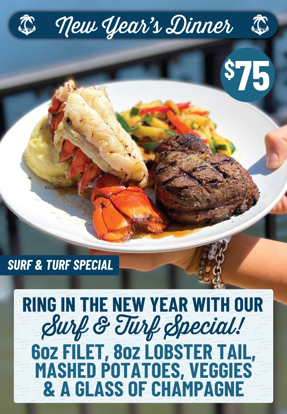 Ring in the night with our special Surf & Turf, waterfront views, and a festive atmosphere
